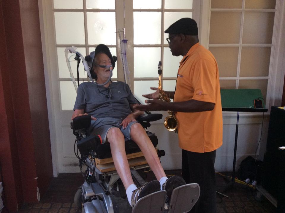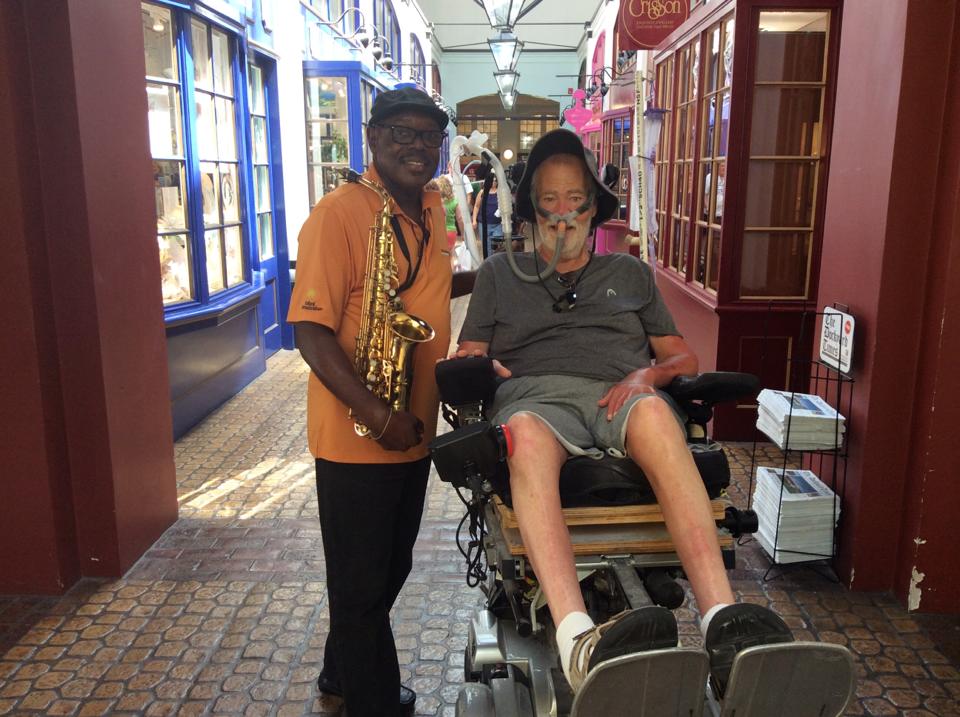 "I am blessed to have met so many people from so many parts of the world. Today I met one of the most incredible persons which has greatly humbled me. Meet Dr. Christopher Pendergast. He has ALS and is a founding member of ALS Ride For Life. I noticed him on Wednesday coming of the ferry in Hamilton in his wheel chair as you see him in the photo. (He was a visiting cruise ship passenger) I later observed him making his way along Front Street during our Harbour Nights' Festival. All I could think was that this man really wanted to visit Bermuda. I went to bed that night with this man's determination on my mind. Then Friday while busking at the Clock Tower Mall, the doors opened in front of me and in he rolled. I was determined to know about him for reasons that some of you might understand. I watched him role down the corridor out of sight. Then I noticed the lady who was accompanying him walking by herself and I abruptly stopped playing and got her attention to enquire about him and his illness. I was totally blown away. Our lives somehow mirrored each other's with the difference being that his situation was known to be fatal. After sharing my story with the lady who happened to be his care giver and expressing that I wish I had met him, she went to catch up with him as he had already left the mall for the ship. To my amazement, the doors in front of me opened twenty minutes later and in he rolled. A special trip back to the mall to meet me. I was sooo humbled. We had a great chat, I gave him one of my CD's, we listened together, at his request, to the song "I get by with a little help from my friends." In his condition he has done so much for others affected by ALS, raised millions of dollars for the cause and lived with the illness years beyond the expectancy and longer than others diagnosed with ALS. If you would like to know more about ALS and or Dr. Christopher Pendergast, there is a FB page under ALS ride for life. God puts people in our spaces for particular reasons. I understand better now. Please include Dr. Christopher Pendergast in your prayers and remember that no matter how bad your situation might be, there is some one worse off than you. On the other hand, adjust your attitude and do the things in life that you have always wanted to do should the opportunity present it's self. As long as there is life in your body, there are things that you can do to make a difference for yourself and others. Thank you Dr. I hope I can meet him again." - Wendell "Shine" Hayward